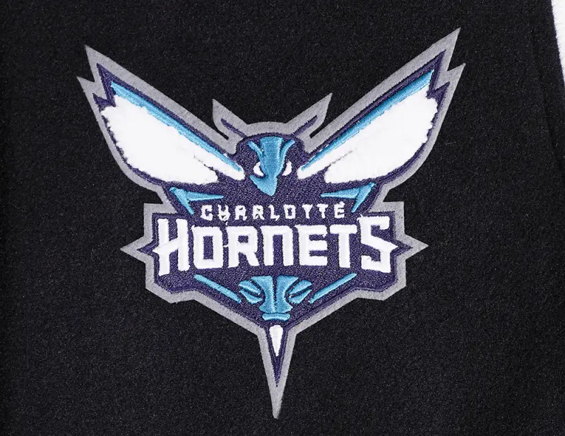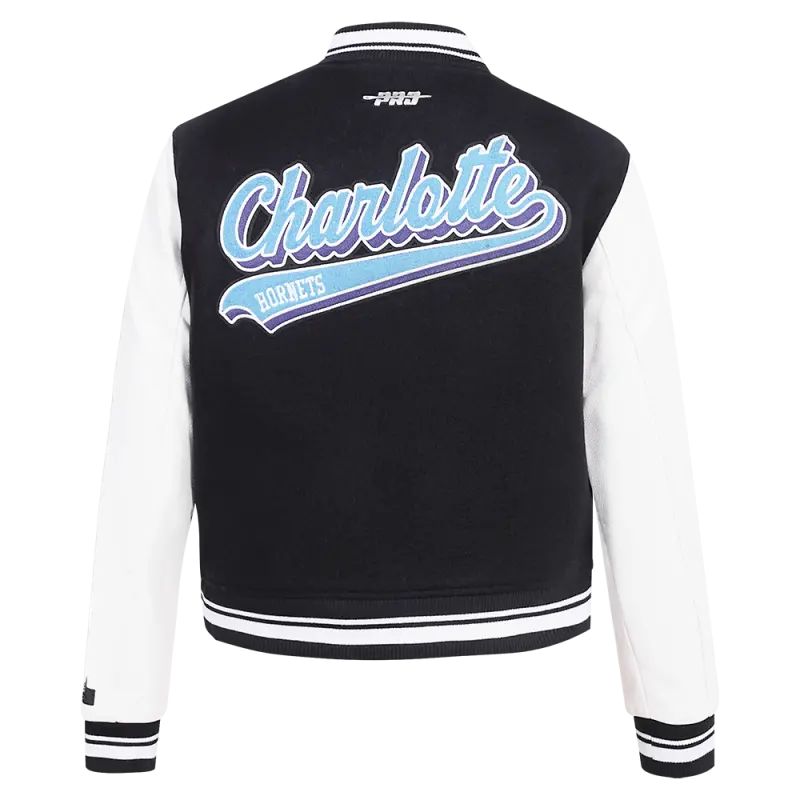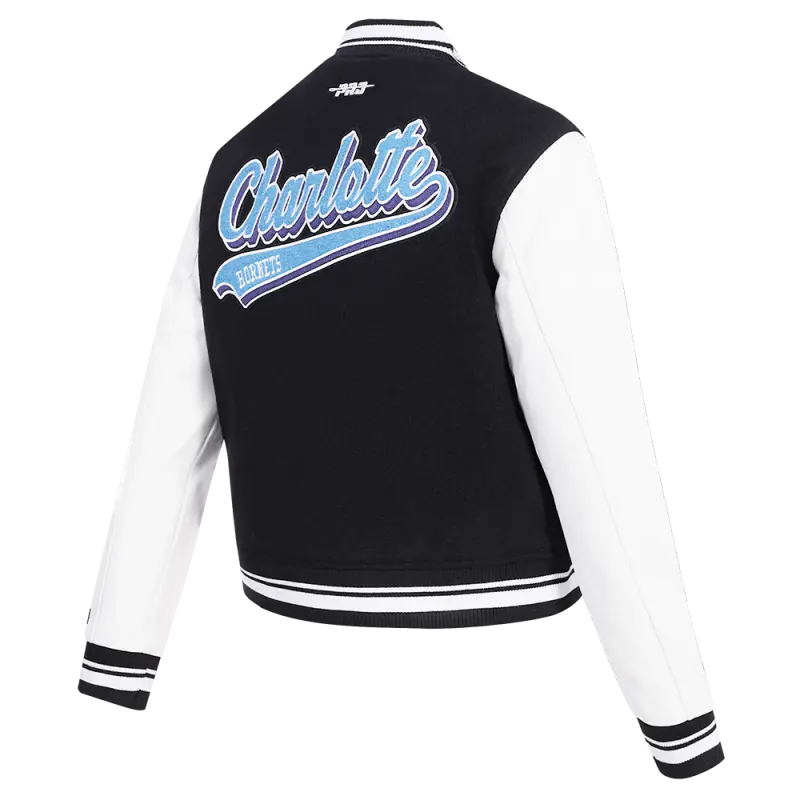 NBA CHARLOTTE HORNETS SCRIPT TAIL WOMEN’S WOOL VARSITY JACKET (BLACK\/WHITE)